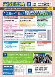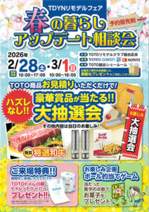 TDYNリモデルフェアのお知らせ 2026年1月20日 最終更新日時 : 2026年1月20日 tanakaya-admin 『春の暮らし アップデート相談会』新しい季節に向けて、住まいのアップデートをしませんか?皆さまのご来場を心よりお待ちしております。 開催日時: 2026年2月28日(土)10:00~17:00 2026年3月 1日(日)10:00~16:00 会場:TOTO越谷ショールーム(越谷市東大沢3-14-12) 当店からのご案内でご来場の方に素敵なプレゼントをご用意しております。 予約優先制となります。 ○ご予約・お問い合わせ株式会社田中屋TEL:048-952-3061